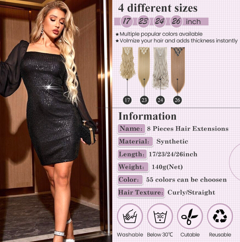 Hair Life:1-12Months(depending on care and usage) 8Pieces 18clips 170g,it is just basic for full head, If you have thick hair,please buy 2 sets or more, it will make you look more natural and pretty.