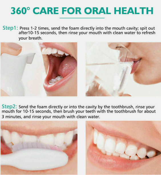 *2. Brush Method: Squeeze proper amount of foam on your toothbrush. Gently brush your teeth and tongue coat for 2-3 minutes, making teeth cleaning and refreshing.