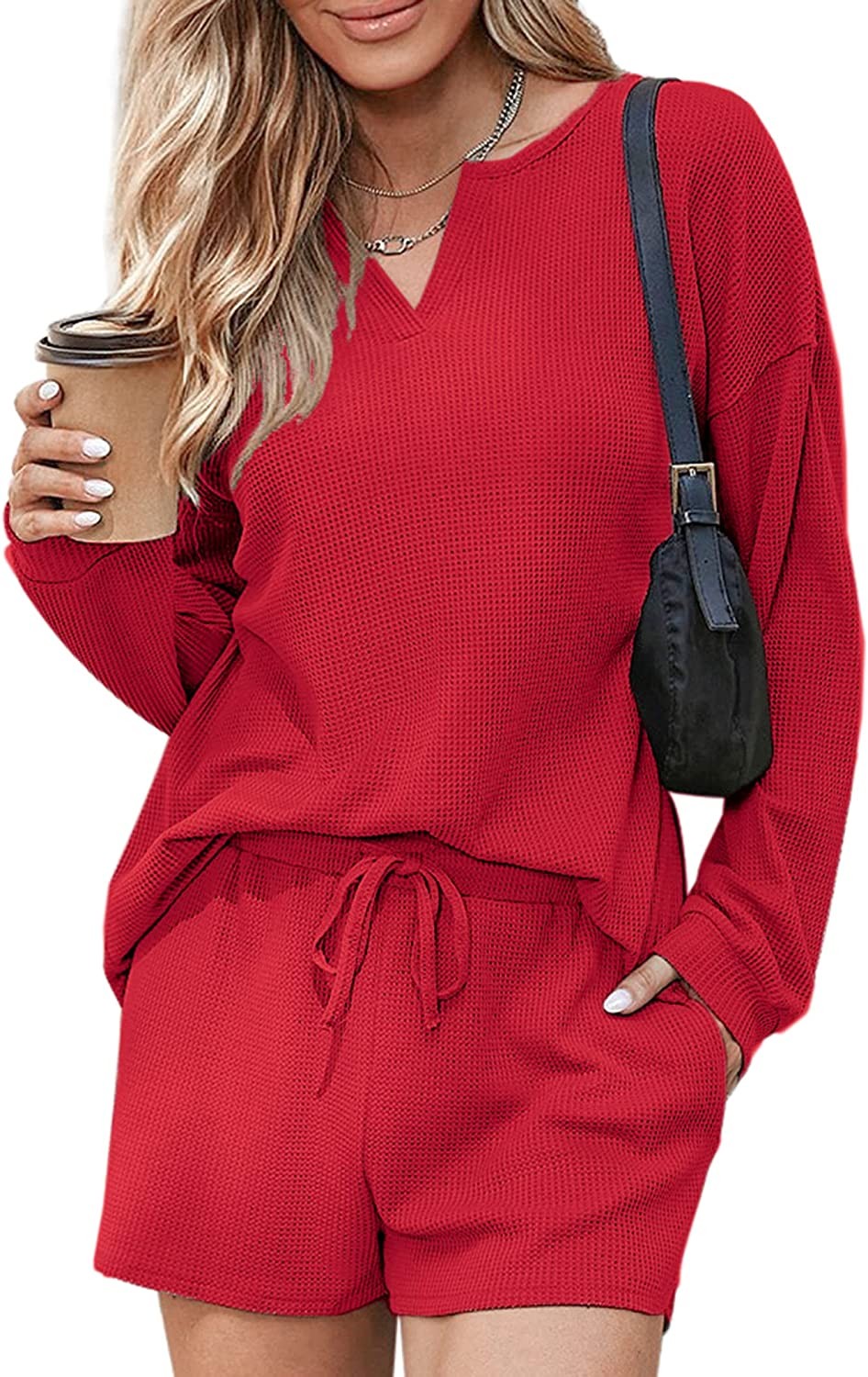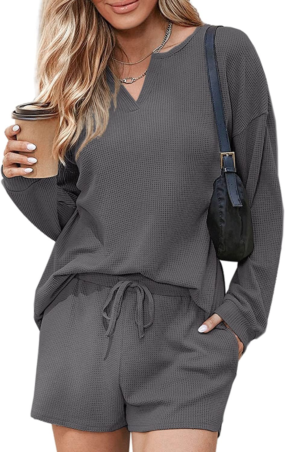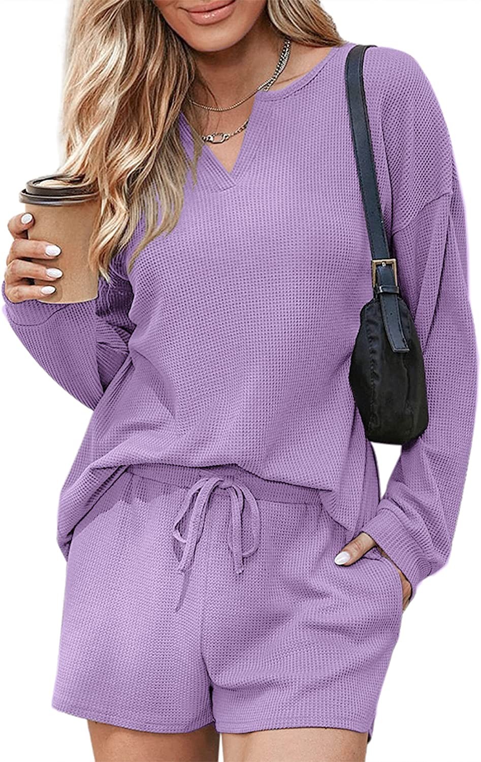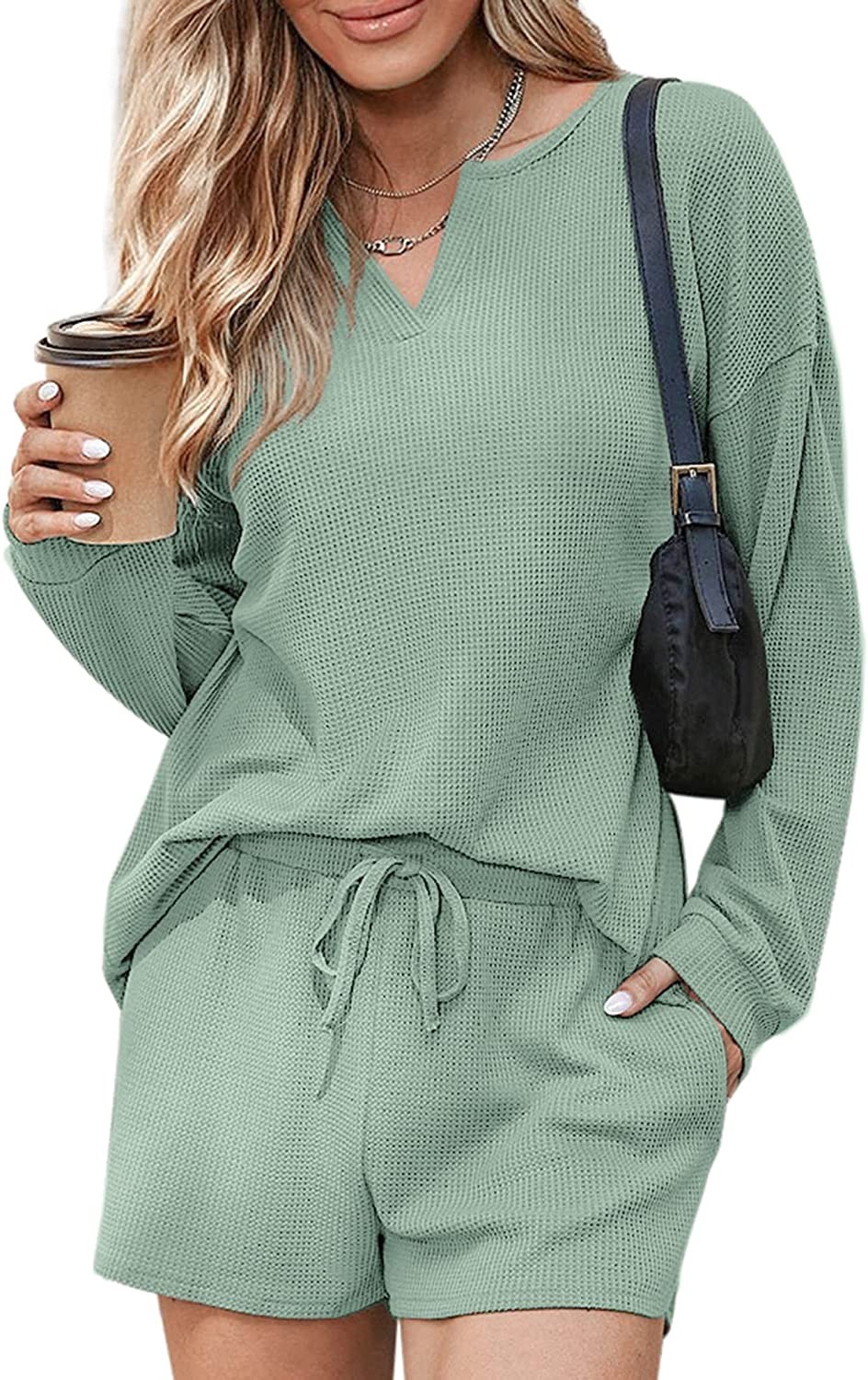 Ekouaer Pajamas Womens Waffle Knit Lounge Set Long Sleeve Top and Shorts 2 Piece