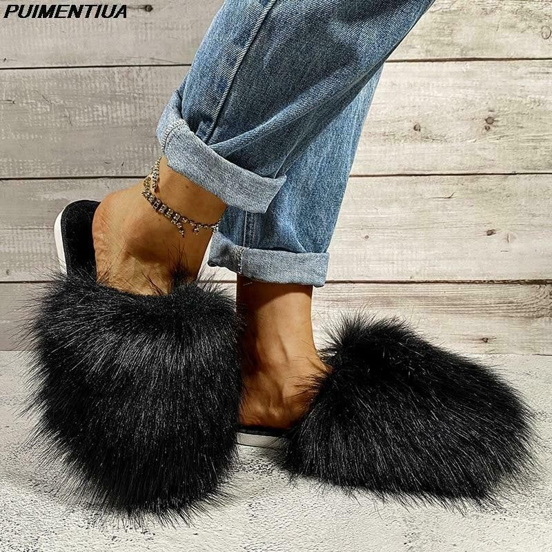 Fur Slides Women Summer Furry Slippers Fluffy Home Shoes Ladies Luxury Fur Flops