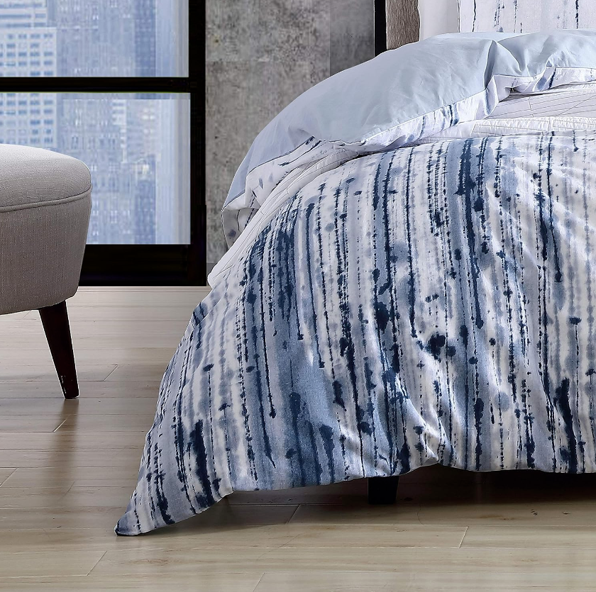 Update your bedding ensemble with the City Scene Sokal Comforter Set. Constructed with soft, prewashed cotton and featuring a bold, ink-dripped print in indigo, the Sokal Set is sure to give you the look of an artist’s studiowithout the mess. Comforter features a polyester fill and a solid light blue reverse. Set is machine washable for easy and convenient care.