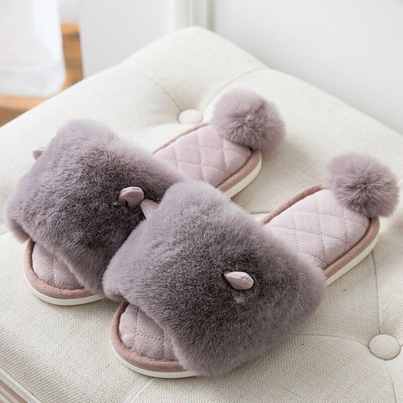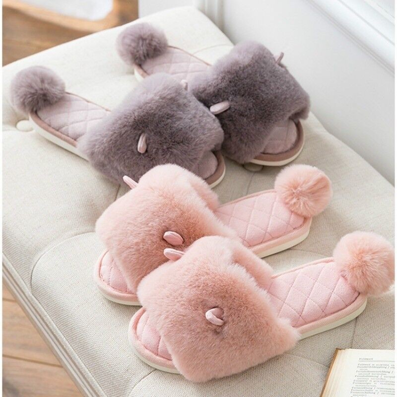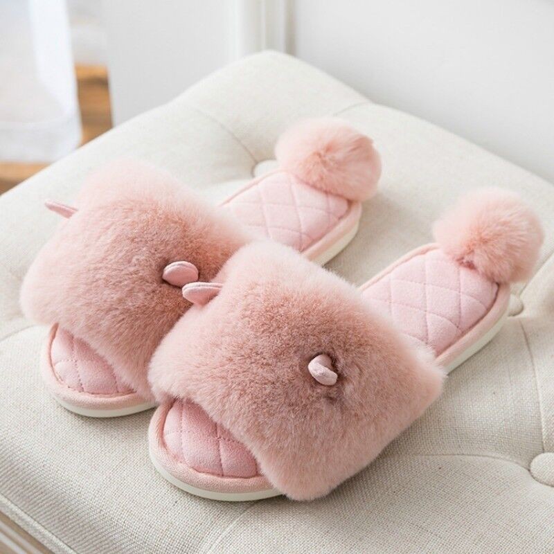 Ladies Winter Faux Fur Slippers Shoes Pom Pom Ear Warm Indoor Home Soft Japanese