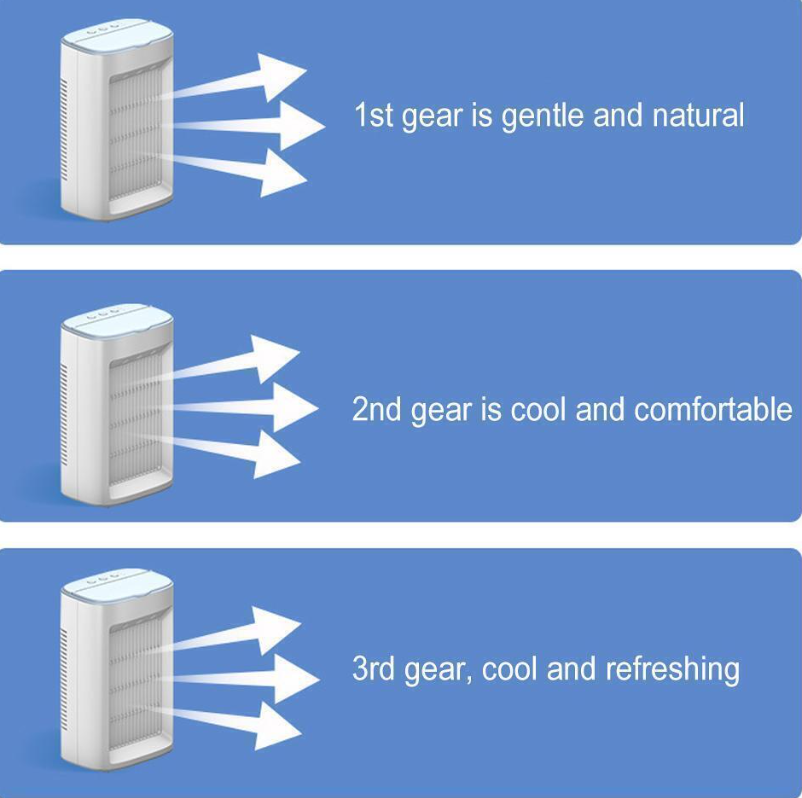 3 speeds, easy to use: We have improved the setup and use of this portable air conditioner. All you need to do is pour in the ice water mixture, connect the USB power cord, and adjust the fan speed. The three-step operation cools the heat around you in seconds, making the air cooler, wetter and cleaner.